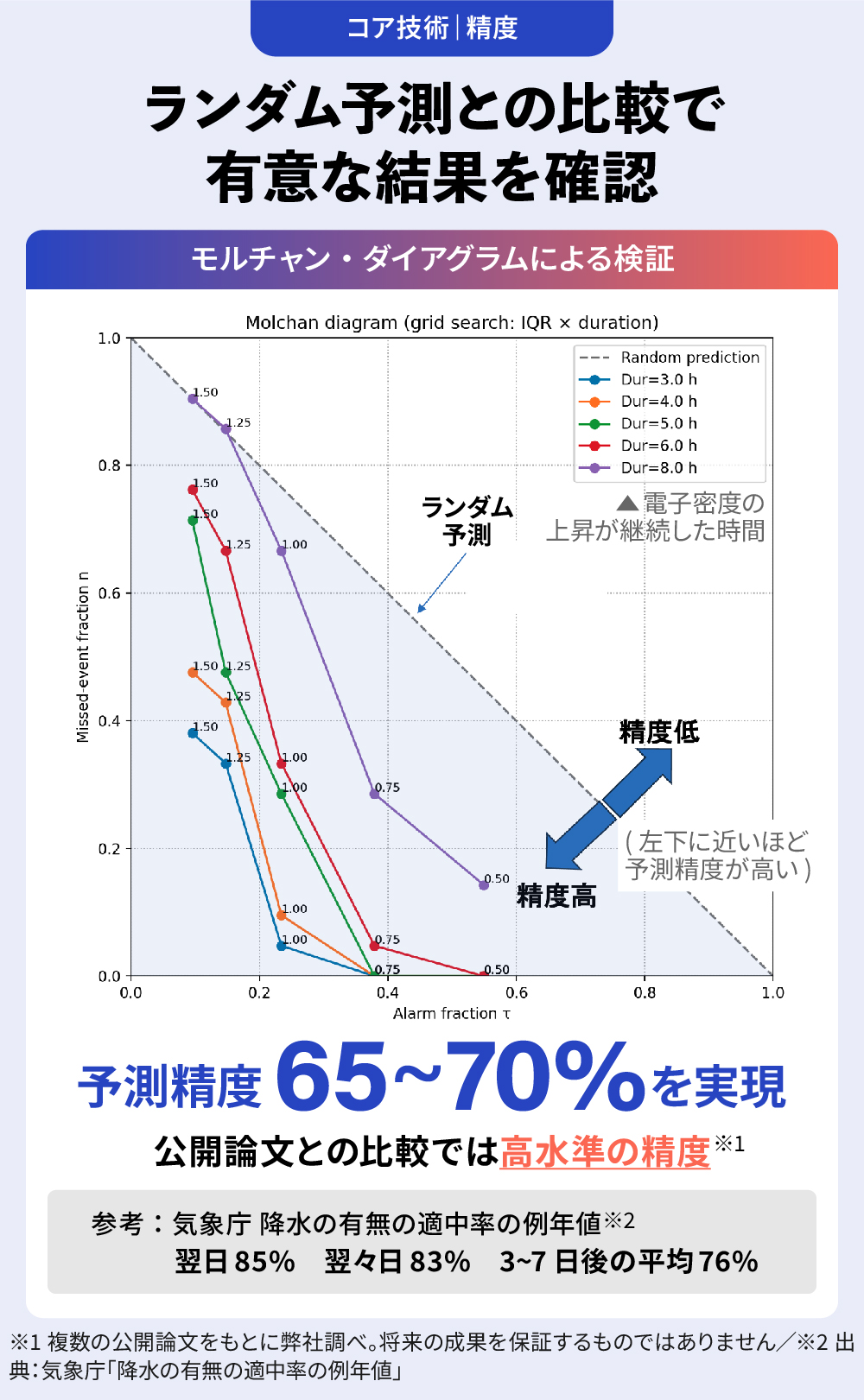 ãŸããäºæž¬ã¢ãã«ã®æ§èœãèŠèŠçã«è©äŸ¡ãããã¢ã«ãã£ã³ã»ãã€ã¢ã°ã©ã ããçšããç¬ç«æ€èšŒïŒ2005ã2009幎ã®çµ±èšïŒã§ã¯ãã©ã³ãã äºæž¬ãšã®æ¯èŒã§çµ±èšçã«ææãªçµæã確èªãããŠããŸããç ç©¶æã«ãããäºæž¬ç²ŸåºŠã§ã¯65ã70%ãå®çŸããŠããã髿°Žæºã®ç²ŸåºŠã ãšèããŠããŸãâ»ã