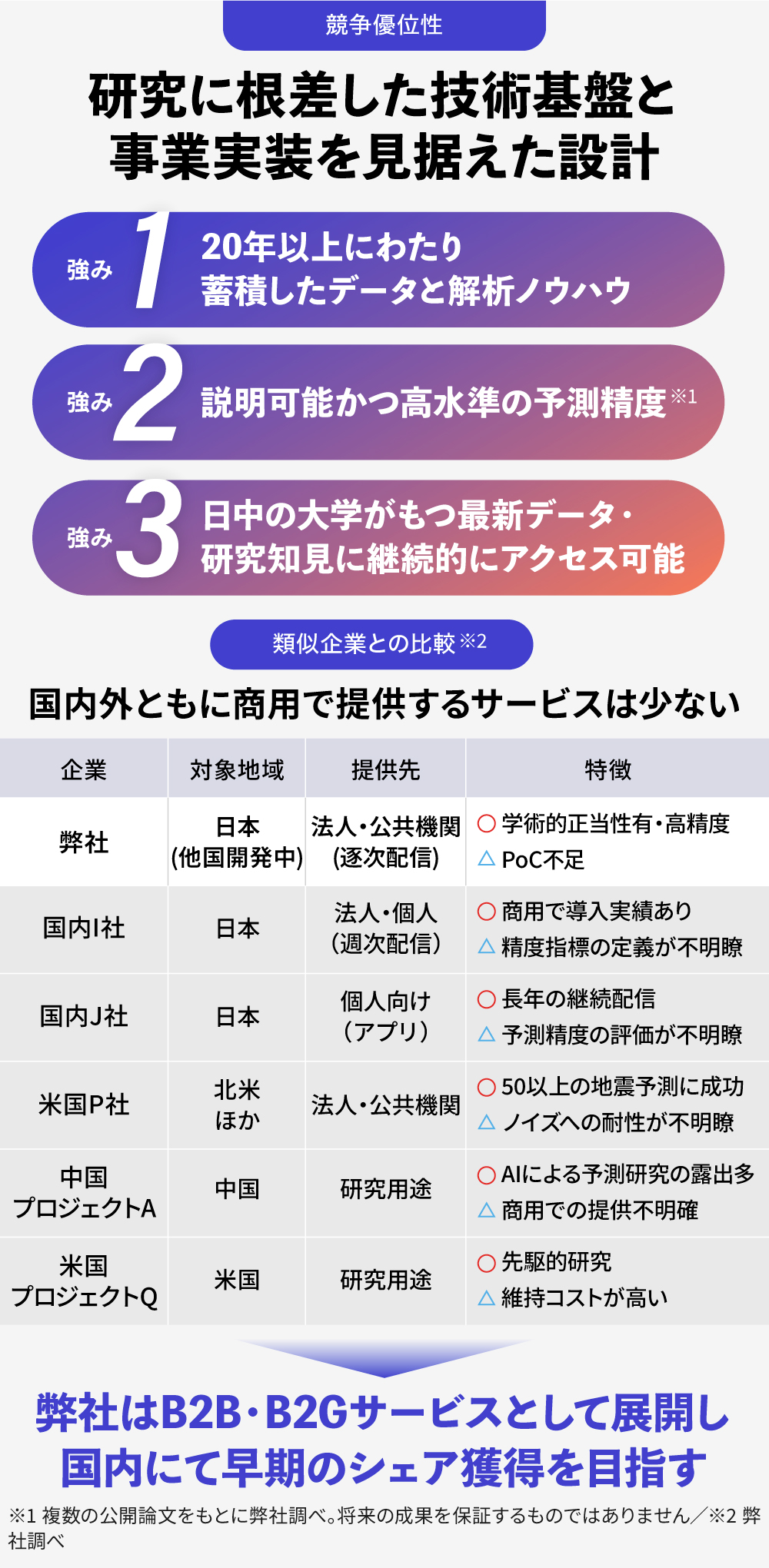 å°éäºæž¬ãæäŸããäºæ¥è ã¯åœå å€ã«è€æ°ååšããŸãããå人åãã®æ å ±é ä¿¡ãäžå¿ãšãããµãŒãã¹ã§ã¯ãBtoBã§æ±ããããç²ŸåºŠææšãå¥çŽåœ¢æ ãžã®å¯Ÿå¿ãååã§ã¯ãããŸããããŸããæµ·å€ã«ãŠå é§çç ç©¶ãè¡ããããžã§ã¯ãã¯äž»ã«ç ç©¶çšéã§ãããåçšæäŸã®å®çžŸãéææ§ã¯éå®çã§ãâ»ã