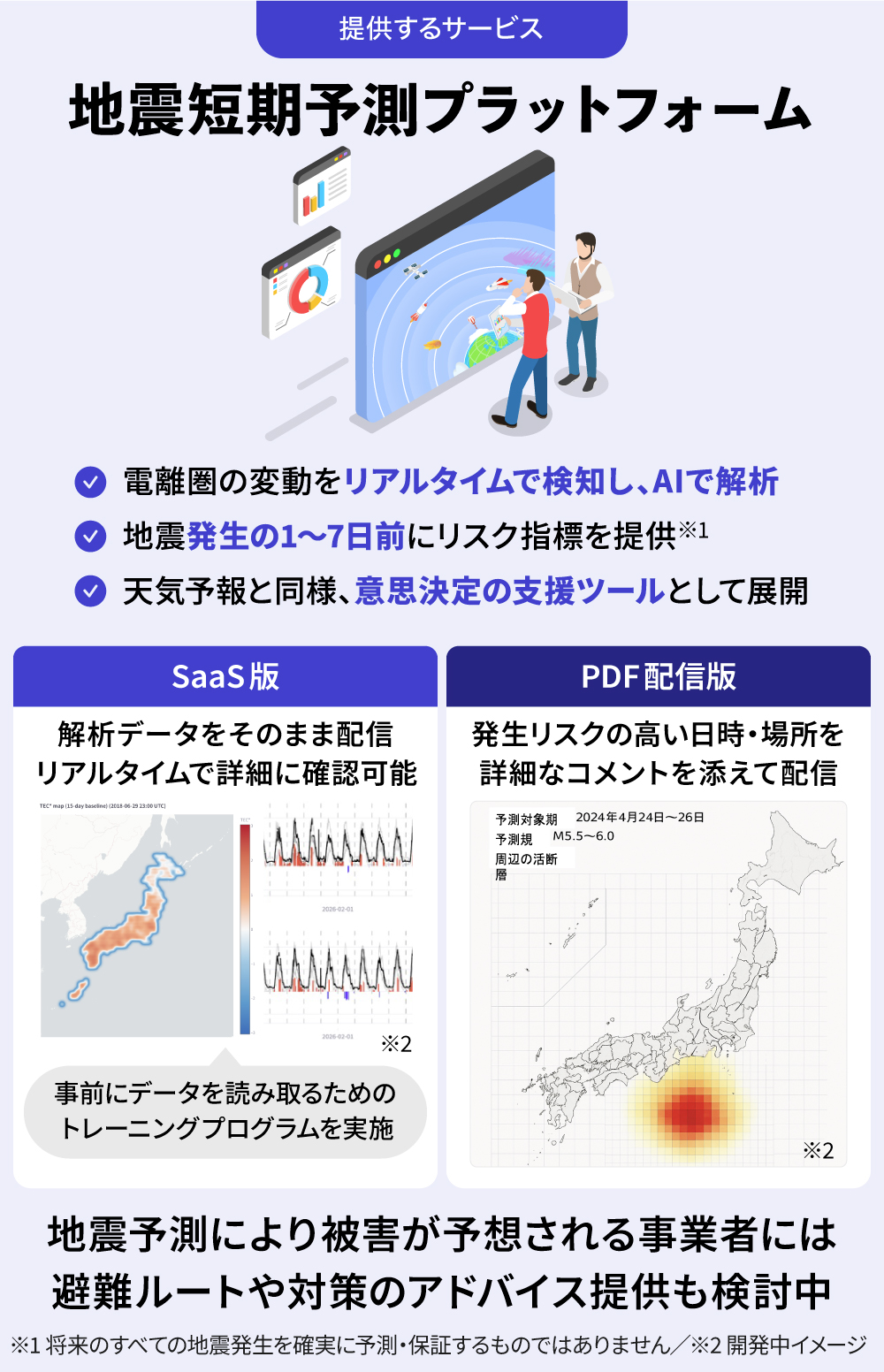 ãå°éçºç確çâ%ããšãã£ãæå®çãªäºå ±ã¯è¡ããããå°éæŽ»åææ°ãããé»é¢åç°åžžææ°ããªã©ã®ãªã¹ã¯ææšãšããŠæäŸããæ³å®ã§ããæ°è±¡äºå ±ãšåæ§ã«ã確çã«åºã¥ããæææ±ºå®ãæ¯æŽããããŒã«ããšããŠãæçµçãªè¡å倿ã¯é¡§å®¢åŽã®è²¬ä»»è ãè¡ãä»çµã¿ã§ãã