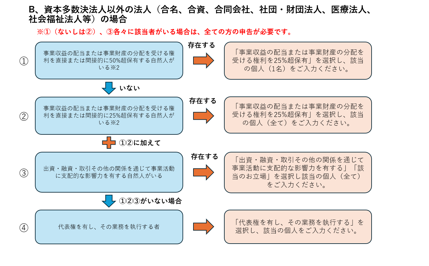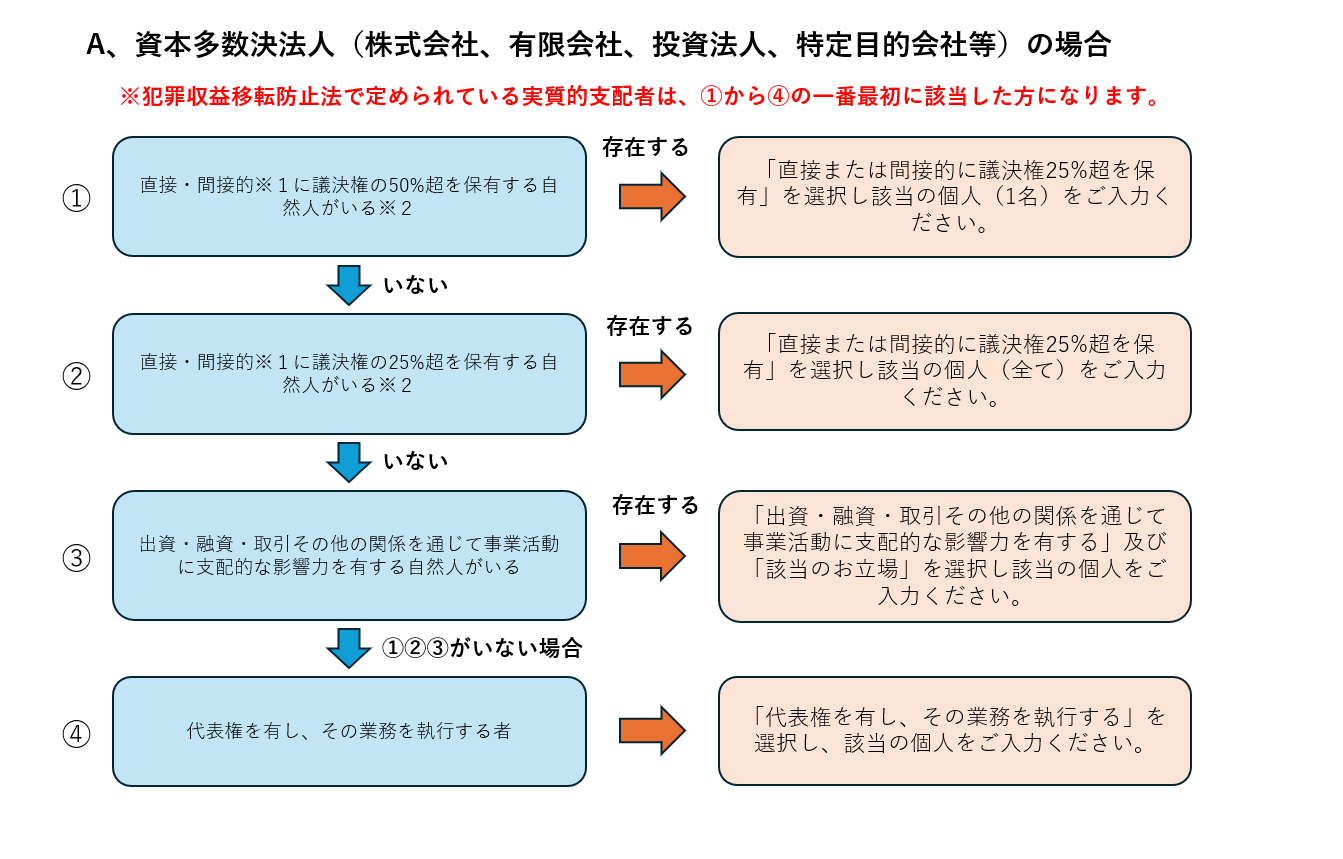 以下のフローに従い、実質的支配者の申告が必要となります。