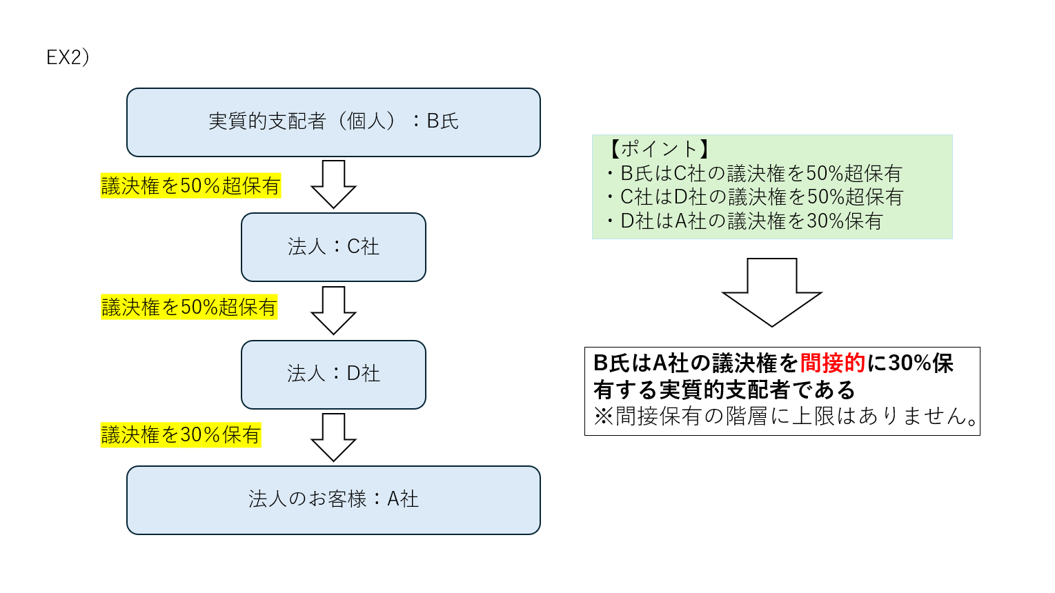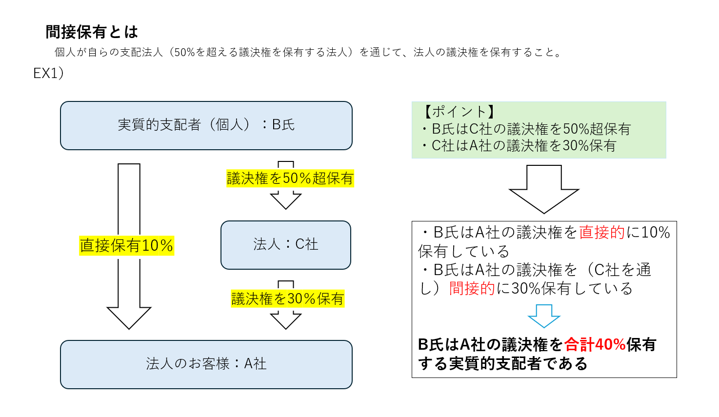 実質的支配者とは、当該法人の議決権を直接または間接に25%超保有する等、