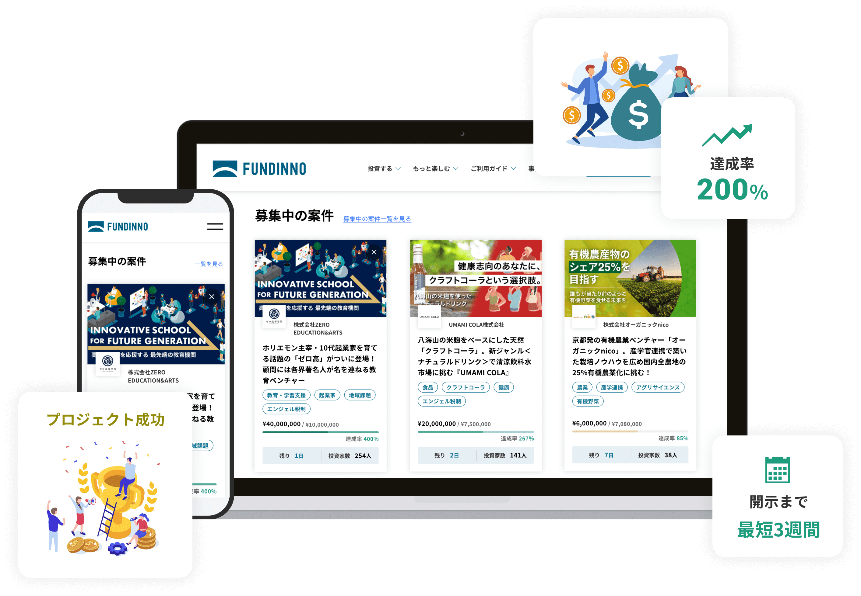 なお、FUNDINNOでは目標募集額(プロジェクトが成立するために必要な目標金額)を設定しており、募集期間中にお申込みが目標募集額に満たない場合、当該プロジェクトは不成立となります。