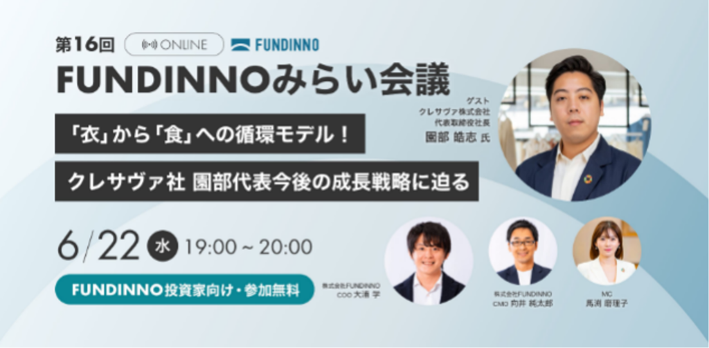 第16回FUNDINNOみらい会議は、クレサヴァ株式会社 代表取締役社長の園部皓志様を特別ゲストにお招きしました。テーマ1では園部様に、事業内容や土に還る服でアパレル業界の変革に挑む想いについてお話いただき、テーマ2では、FUNDINNO CMOの向井より投資家の目線における新株予約権の特徴についてお話しいたしました。そして、テーマ3では、FUNDINNO MARKET開設の背景および最新情報について解説させていただきました。